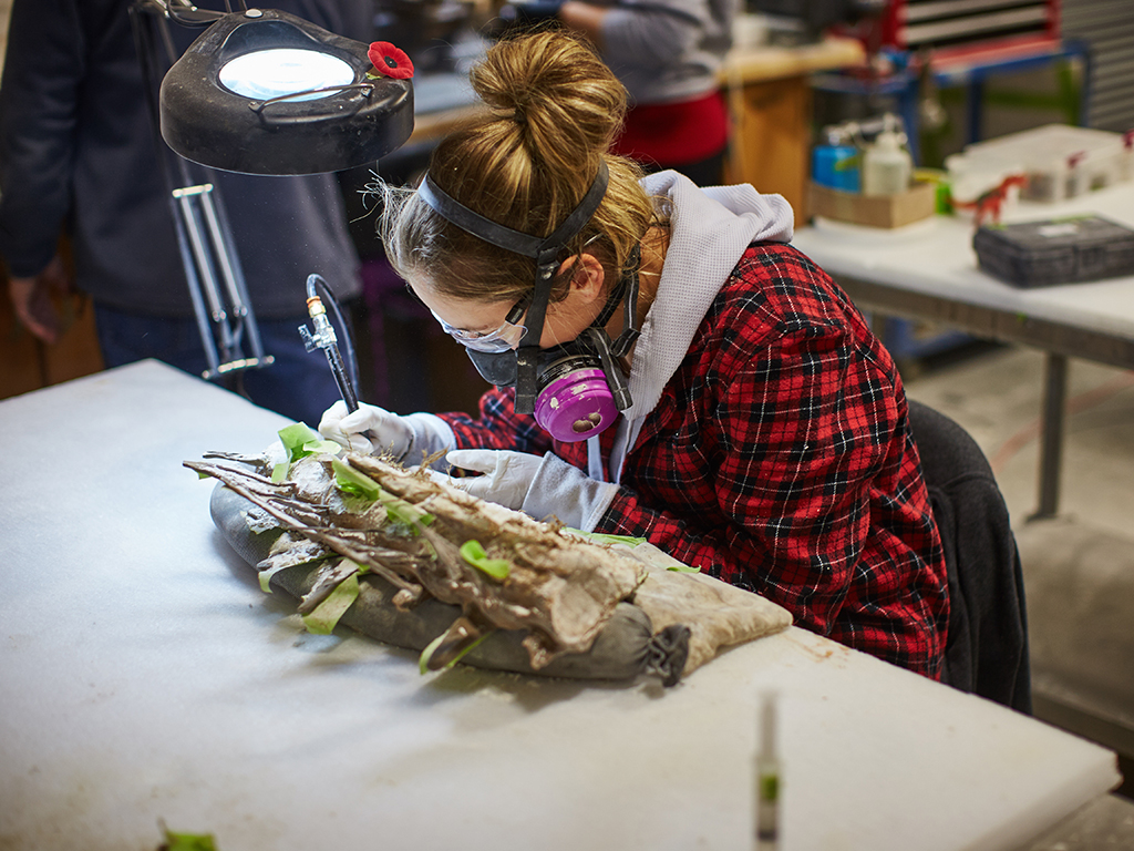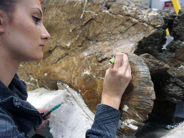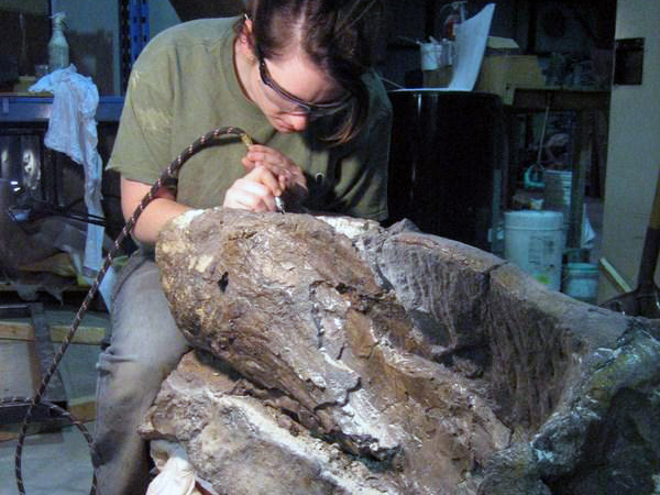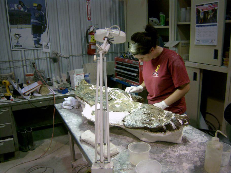 In our fossil lab, we specialize in preparing out skeletal elements from plaster jackets, matrix, or plaques using such tools as airscribes, carbide needles, dental picks, and brushes. We have worked with many museums around the world and the material preferences of the conservators are always adhered to. We are also able to offer suggestions regarding materials and processes from our past experiences. Specimens are stored safely in either custom built sealed cabinets or on our oversize specimen storage racking system. We digitally document and store all relevant information pertaining to an individual skeletal element.